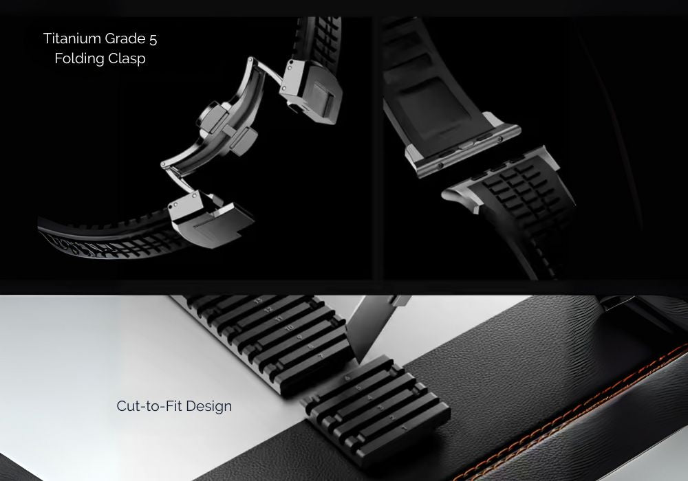 Made of FKM fluoroelastomer and a Grade 5 Titanium clasp, its 3D grenade texture defines 2025’s cutting-edge style.