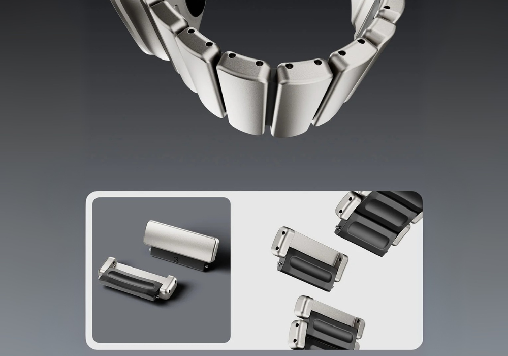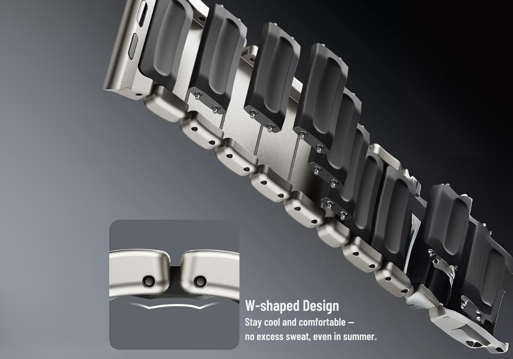 Its titanium components reflect the watch’s premium style and perfectly match its color. Thanks to its silicone interior and W-shaped design the band stays breathable and sweat-free giving all-day comfort and a secure fit.